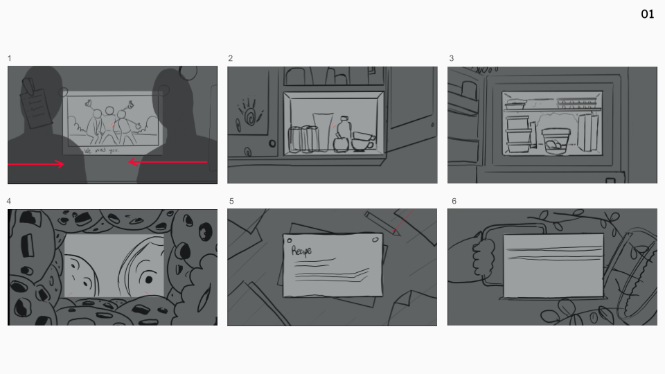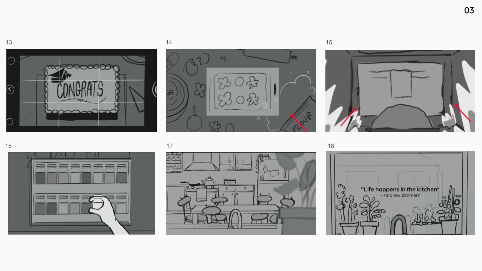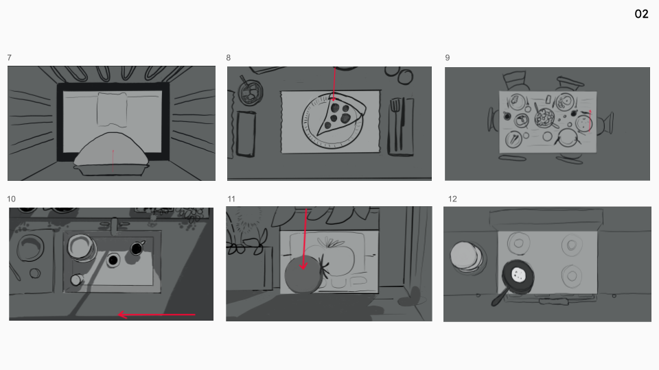 Trying to hone down and develop the proper flow, I made sure that each scene highlighted an aspect of the whole (kitchen).